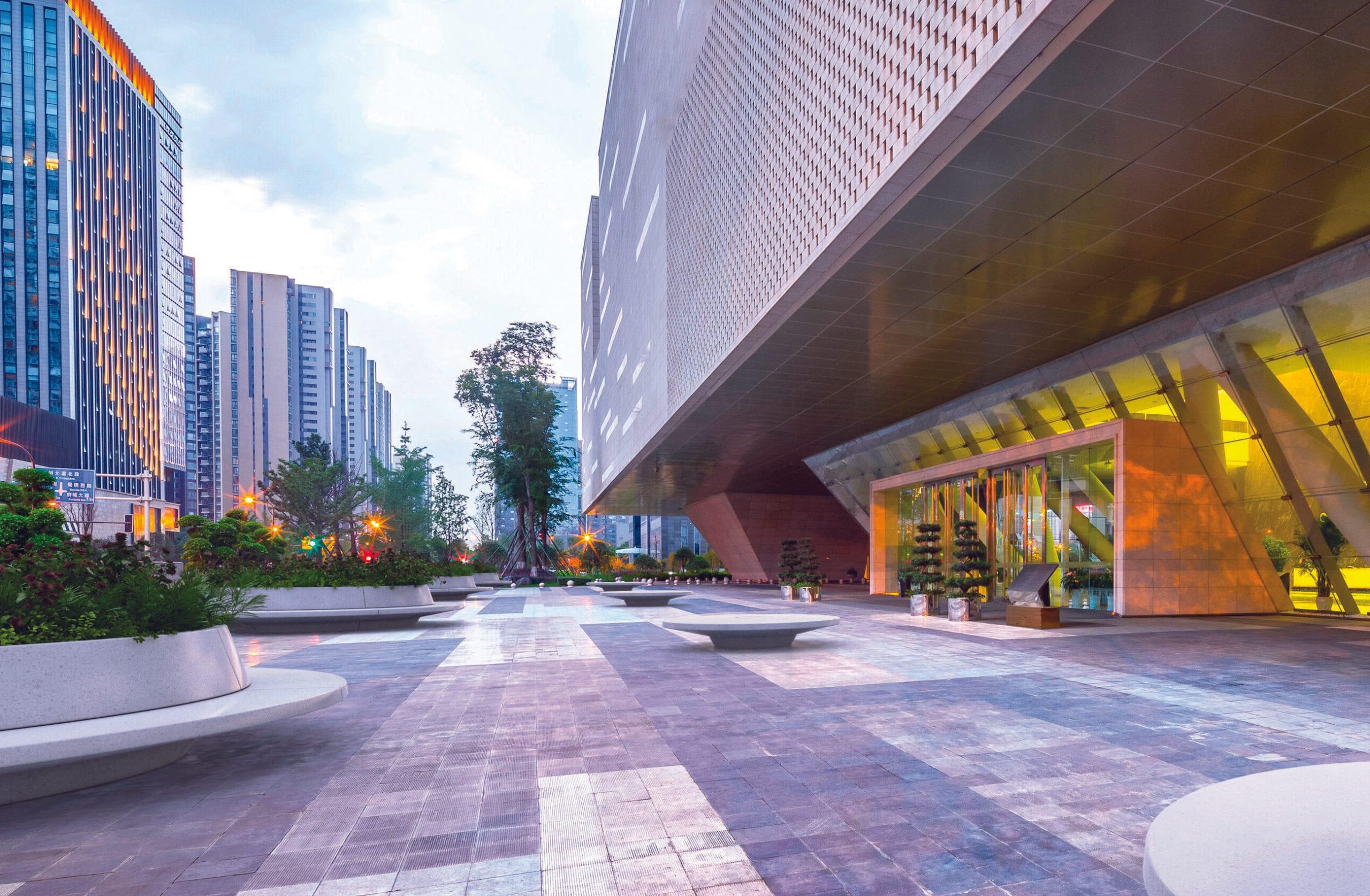 Banc circulaire modulaire modèle LIDO 4500 S, composé de six pierres de taille placées côte à côte pour créer une composition circulaire. La composition est équipée d’un dossier. Il est également possible d’insérer des bandes LED.