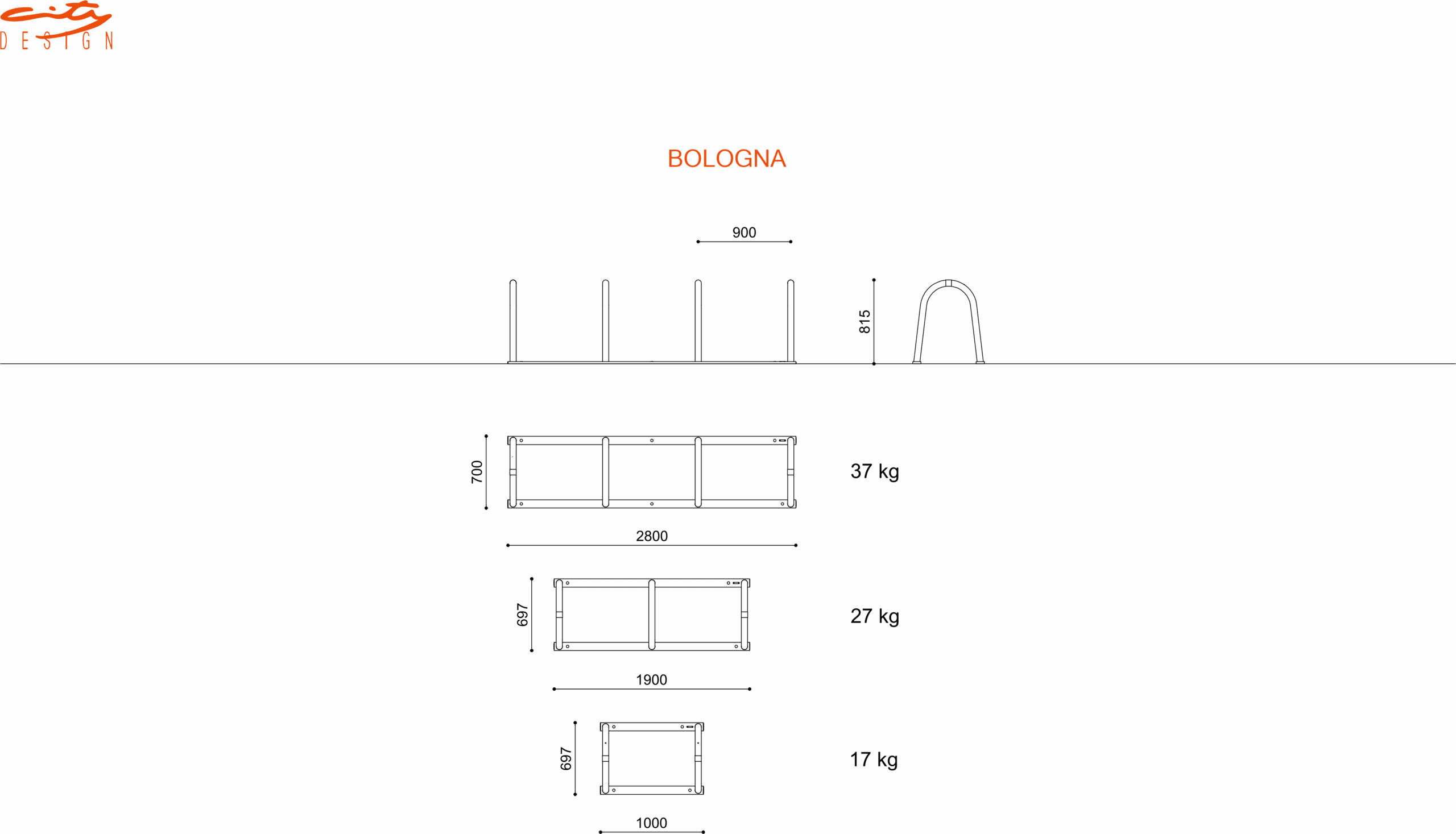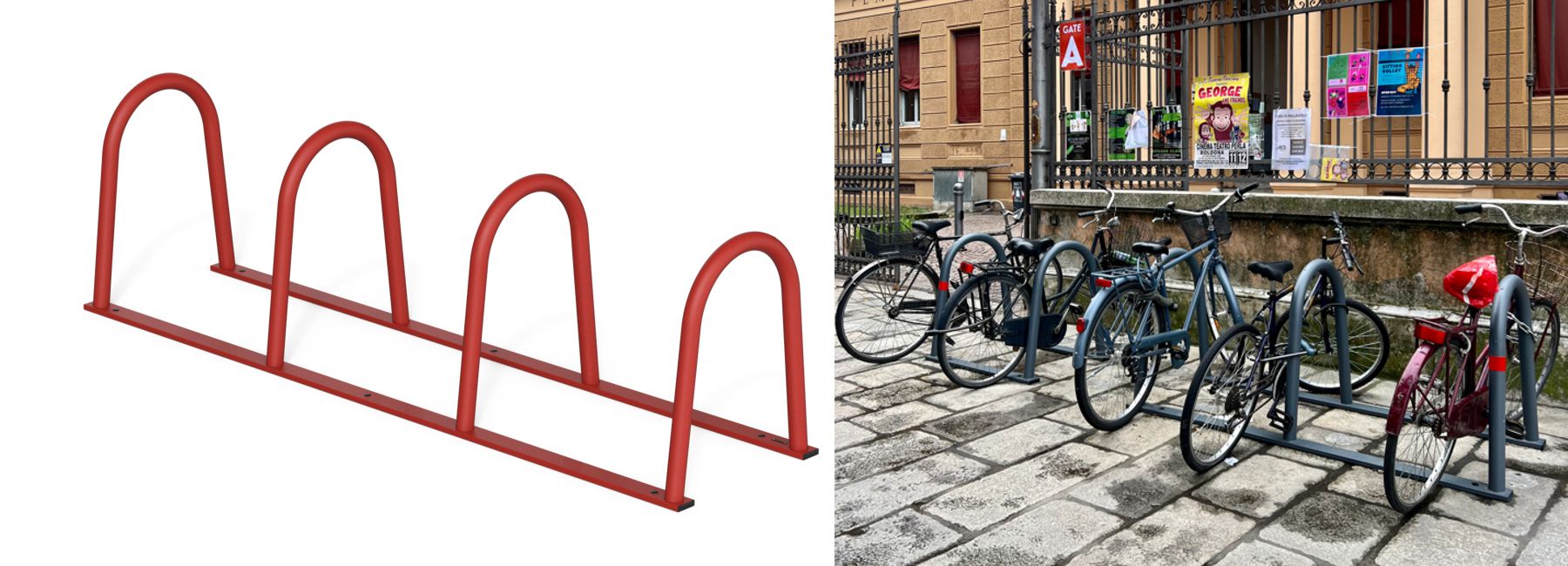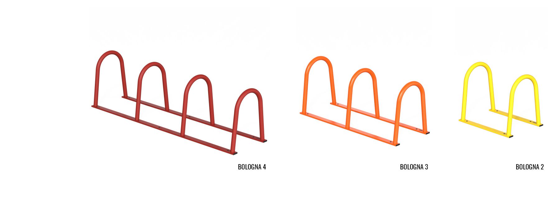Télécharger la fiche techniqueCollection de porte-vélos Bologna fabriqués à partir de deux tubes d’acier rectangulaires horizontaux auxquels sont soudés deux, trois ou quatre arcs en tubes d’aciers.